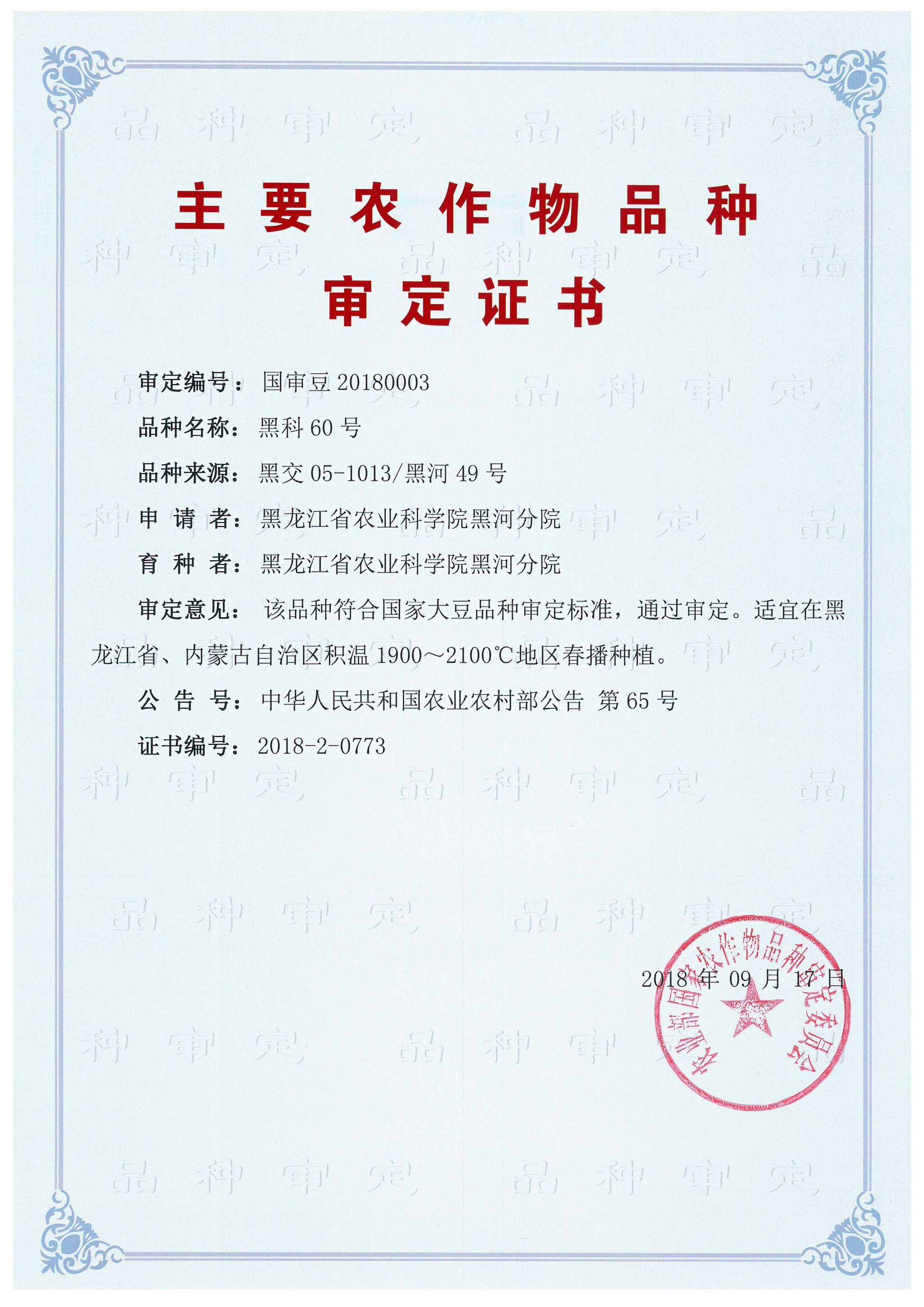 产量表现:国家:2016~2017年参加北方春大豆极早熟组品种区域试验,两年平均亩产150.3千克,比对照增产8.9%。2017年生产试验,平均亩产174.4千克,比对照黑河45号增产12.4%。黑龙江省:2015~2016年区域试验平均公顷产量2305.9公斤,较对照品种黑河43号增产11.3%;2017~2018年生产试验平均公顷产量2762.4公斤,较对照品种黑河43号增产12.8%。