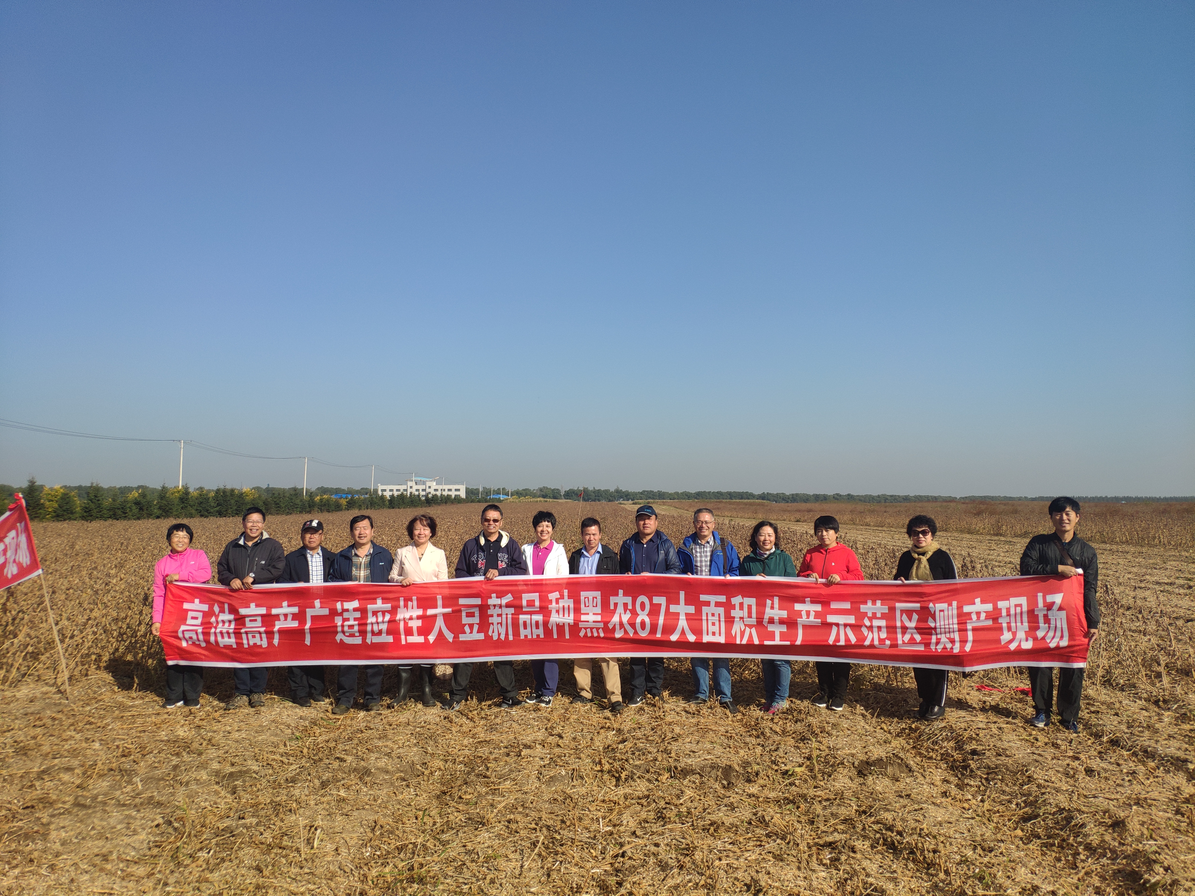 9月26日,双城区东跃现代农机专业合作社大豆田中人头攒动,随着联合收割机的转动,由我院大豆所、耕作栽培所共同举办的大豆新品种“黑农87”实收测产现场会正在进行。经过品种示范区GPS面积定位、联合收割机实收大豆脱粒和称重、数据汇总等一系列科学测产程序,专家组宣布了测产结果:“黑农87”示范面积1800亩,平均亩产250.87kg。