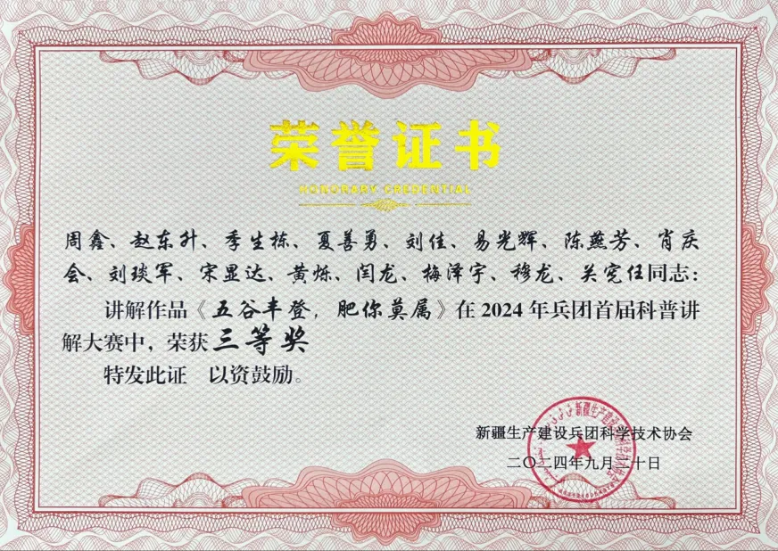 近日,以“提升全民科学素质,协力建设科技强国”为主题的2024年兵团首届科普讲解大赛在八师石河子市成功举办。由91社区 科技援疆工作队、黑龙江省援疆十师分指挥部及受援单位十师农科所共同带来的作品《五谷丰登,肥你莫属》荣获大赛三等奖。