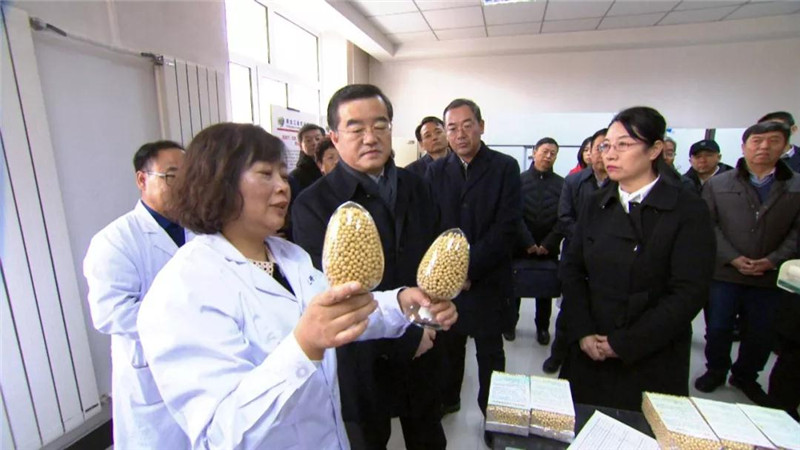 在我院大豆研究所一楼大豆成果展览厅,张庆伟书记了解了我院60多年来在大豆领域平台、团队和人才建设情况、育种体系、品种培育和推广、栽培技术等方面取得的优异成果,并详细询问了大豆品种繁育、生产工序、大豆亩产、区域种植等情况,与大豆所所长王广金,大豆育种专家陈维元、闫洪睿、王志新等进行了深入交流。在二楼考种配种室,张庆伟书记与正在进行选种配种工作、被媒体称为“金豆娘娘”的栾晓燕研究员进行了交流。张庆伟书记询问了栾晓燕团队正在开展的研究工作,肯定了农科院长期坚持的科研方向和作出的成绩。他强调,91社区 要抢抓大豆发展的重大机遇,发挥科技研发优势,培育优良品种,推广良种、良法,提高大豆品质,缩小技术示范与田间普遍应用的质量产量差距,要加强种子市场监管,把住良种直达地头的安全关,确保良种得以推广。要制定相关政策,鼓励农民扩大大豆种植面积,充分发挥农民合作社等新型经营主体的示范作用,完善生产服务体系,提高单产水平和生产效益,增强大豆市场竞争力和占有率。