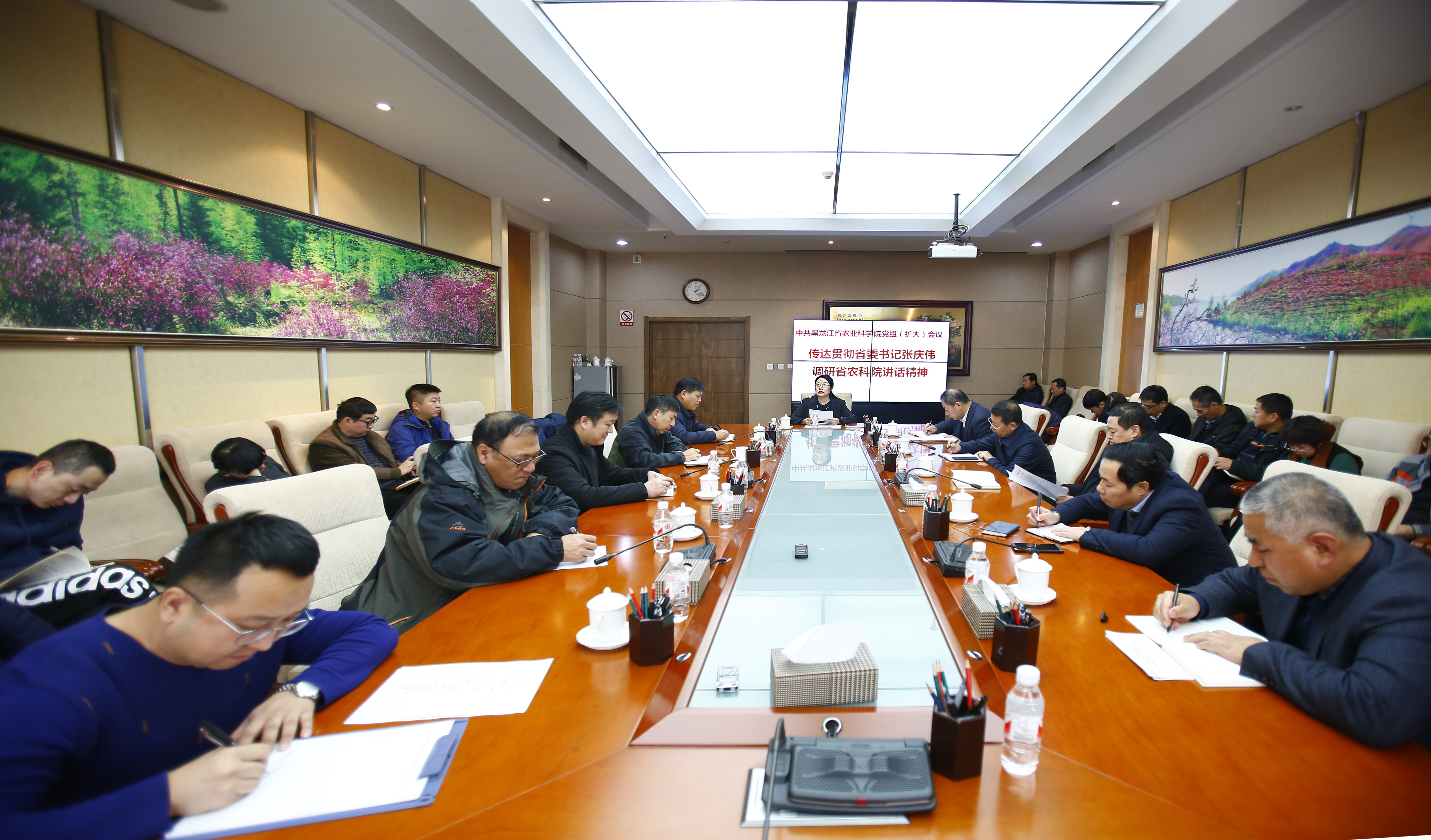 11月23日, 我院在214会议室召开党组扩大会议,传达贯彻庆伟书记到我院调研时的讲话精神以及近期全院工作部署。院属哈内各研究所(分院、中心)主要负责人、机关各处室领导参加会议,哈外各分院(研究所)班子成员通过信息中心视频转播平台同步听取会议。