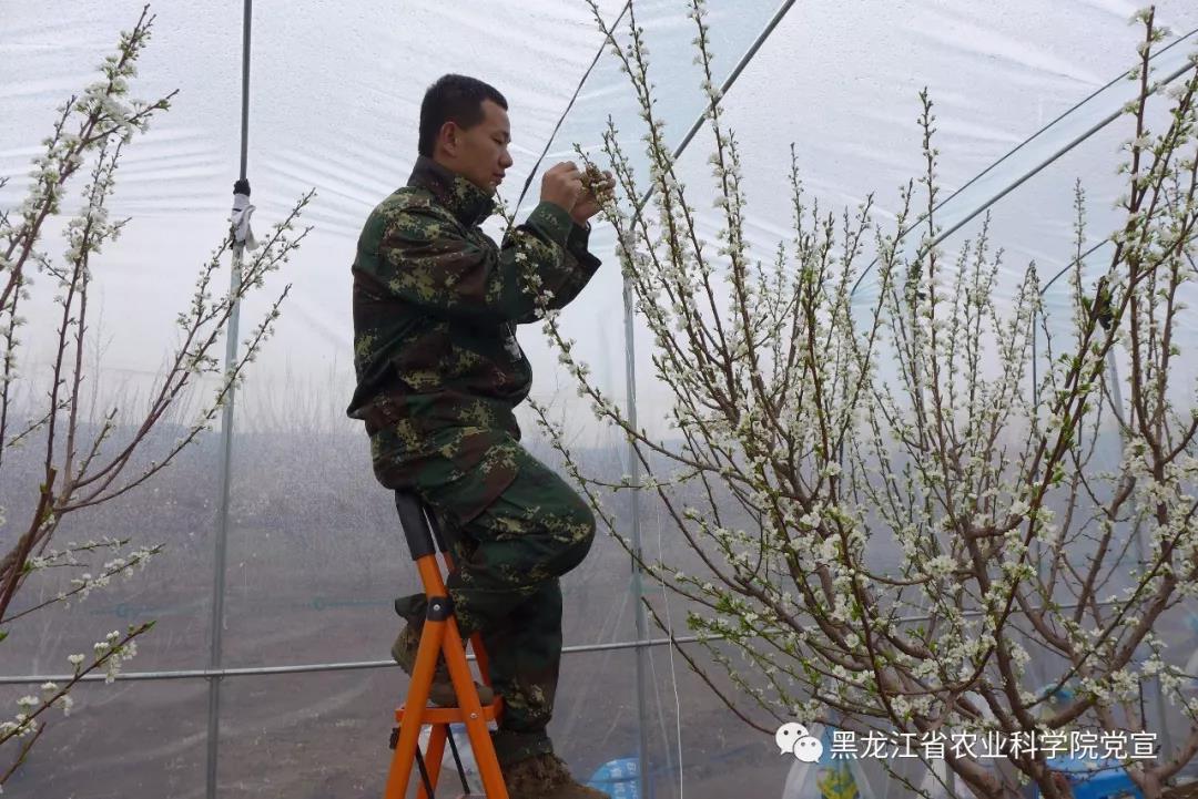 (5月2日,牡分院林存学同志正在进行李育种杂交授粉工作,从花粉选择、组合配制再到授粉后管理,都是李育种工作中非常重要的环节)