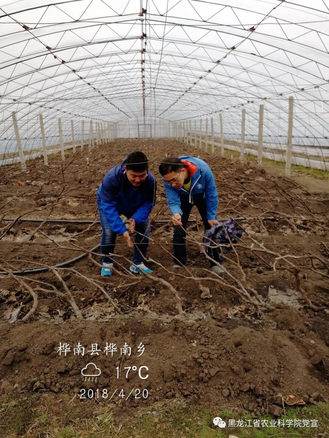 (4月20日,牡分院宗春美和刘畅到桦南县桦南乡查看农户葡萄园的枝条修剪及萌芽情况,指导农户春季葡萄生产,帮助农户解决葡萄病虫害防治问题)