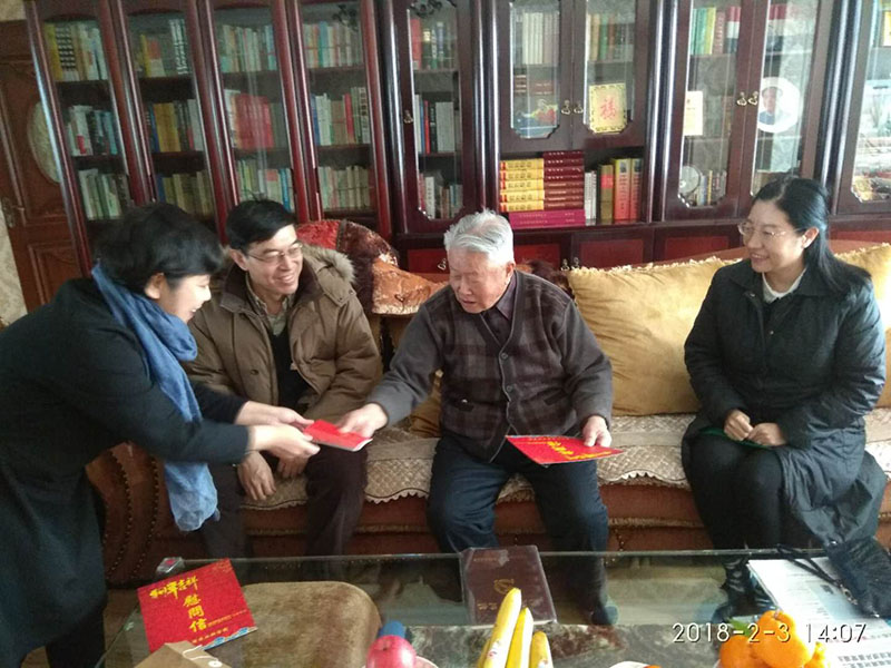 2月3日下午,院党组书记刘娣带领机关党委专职副书记于佰双、离退休职工工作处处长贺雨青、财务处副处长高锋到离休老干部孟庆连家中走访慰问,代表院党组向老领导送上节日的祝福。刘娣书记与孟庆连亲切交谈,详细介绍了我院近期取得的成绩与目前的重点工作。孟庆连十分高兴,对我院取得的成绩表示祝贺。贺雨青处长为老领导送上了党章和党员学习笔记。孟庆连十分感谢组织的关心,兴奋的介绍起学习十九大的情况并展示了学习剪报。刘娣书记代表党组祝愿老领导身体健康,离休生活幸福并表示院党组会带领全院职工努力工作,不负老领导的殷切期望把农科院建设的更好。