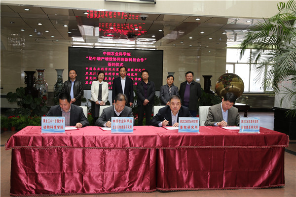 4月21日,我院与中国农科院合作的“奶牛增产增效协同创新科技合作”签约仪式在我院主楼一楼大厅隆重举行。我院副院长耿月伟主持签约仪式,党组书记刘娣和中国农科院党组书记陈萌山作重要讲话。黑龙江省畜牧兽医局科技处处长胥天君代表畜牧局参加了签约仪式。中国农科院科技局梅旭荣局长、成果转化局袁龙江局长、院办姜梅林副主任、苗水清处长,以及我院总农艺师矫江、黑龙江八一农垦大学副校长王金满、黑龙江省农垦科学院院长马守义等出席签约仪式。