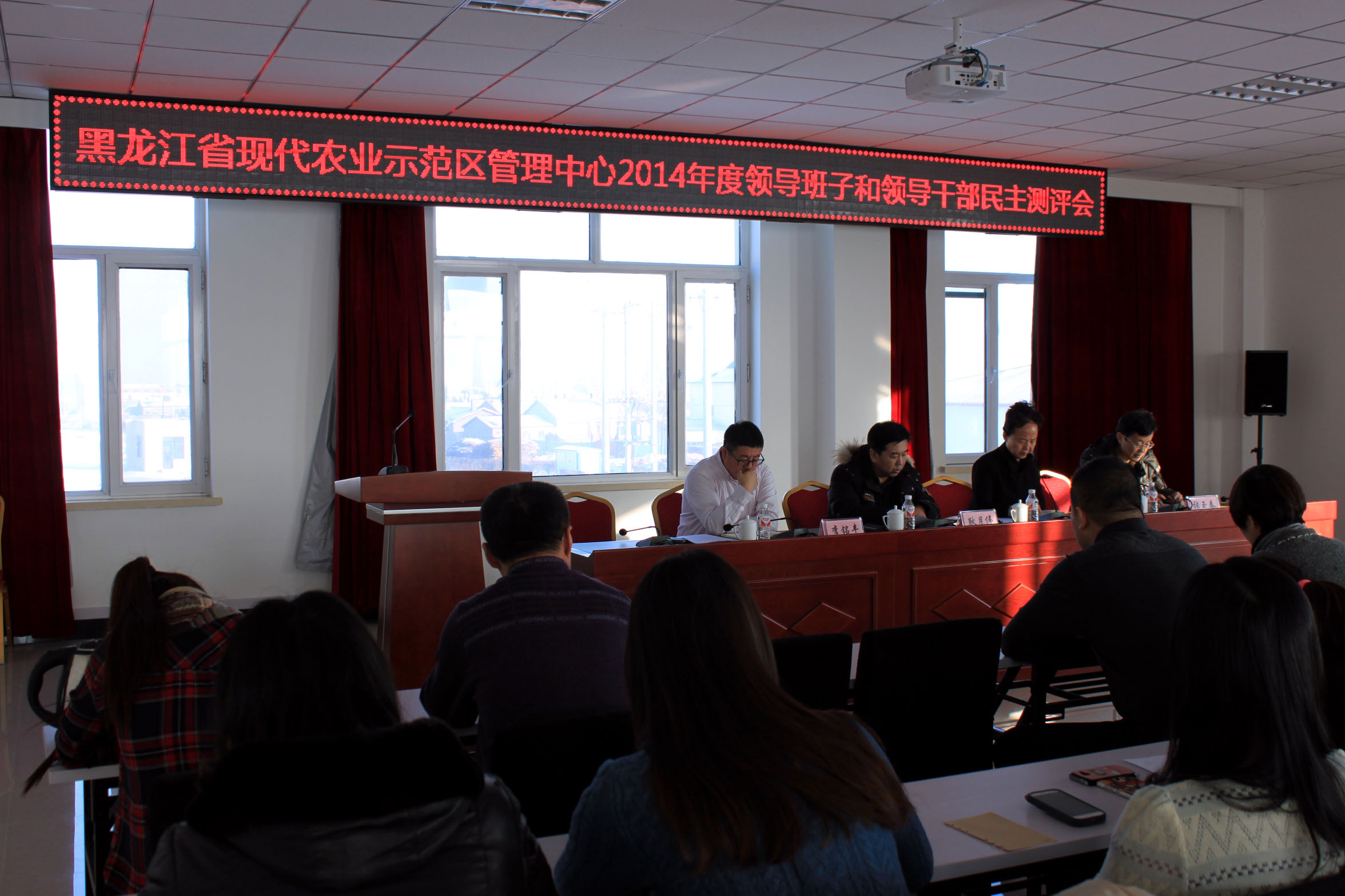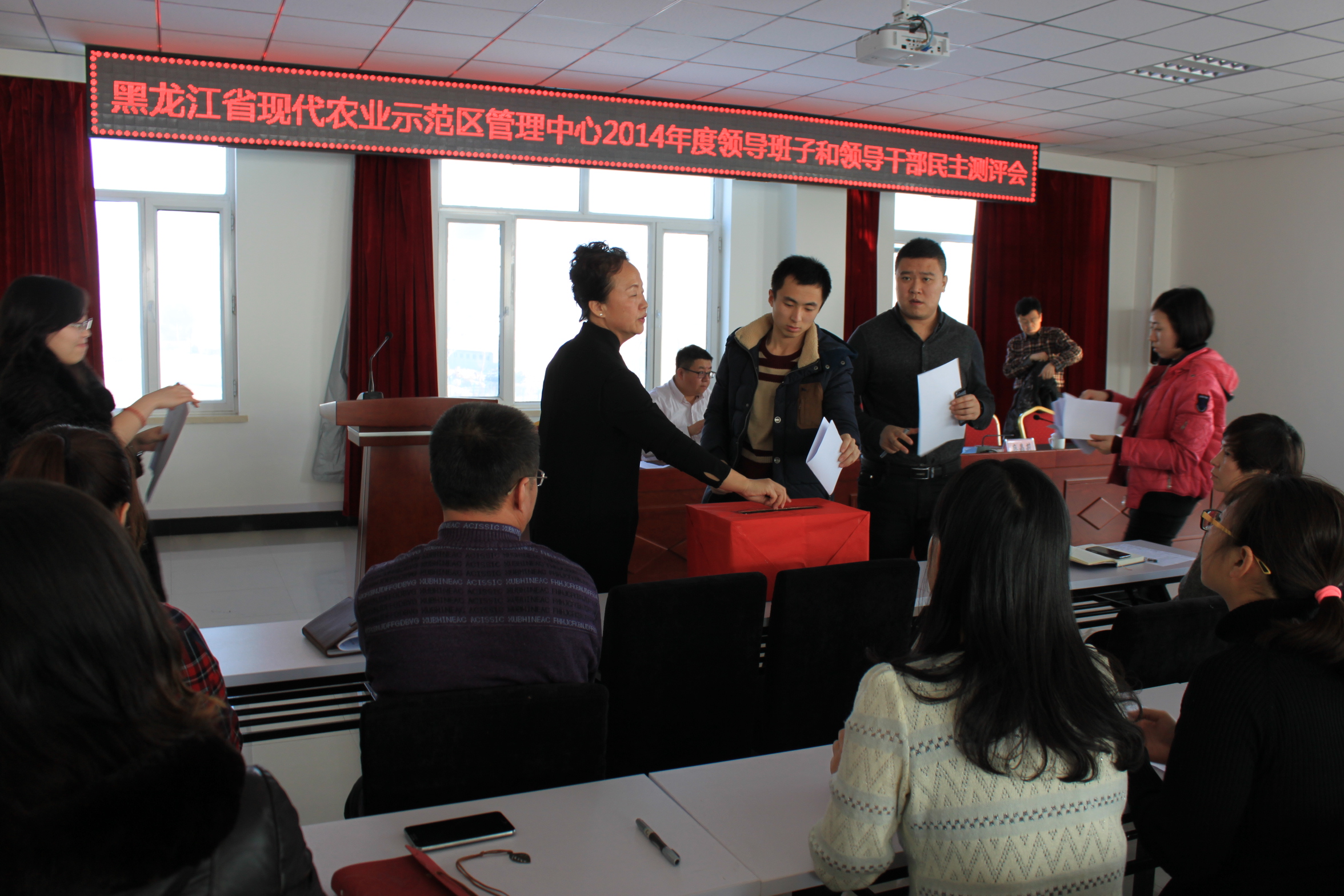 2015年1月8日,按照91社区 党组织的统一部署及要求,以副院长耿月伟为组长,行政处副处长张玉春、人事处科长张淼、人事科科员陈磊为组员组成的第六考核组莅临黑龙江省现代农业示范区,对示范区2014年度工作及领导班子进行考核。上午9点30分会议在示范区管理中心会议室准时召开,示范区全体职工参加了此次民主测评会。
