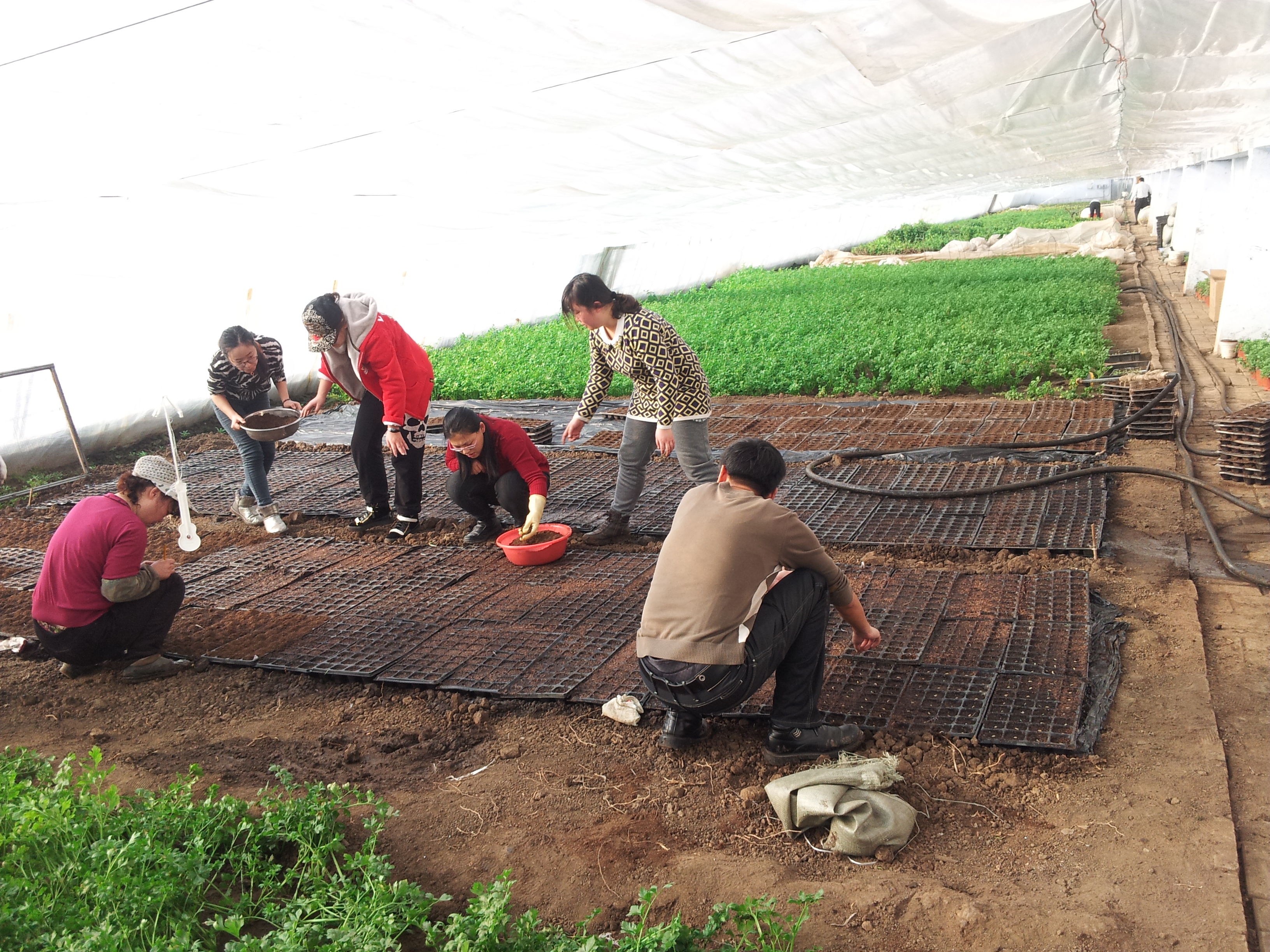 1月30日,示范区再次组织部分职工来到温室大棚,进行育苗、移苗工作,温室与菜窖截然相反,即使在冬季,室内温度也都达到30℃左右,尤其临近中午温度最高达40℃。在温室里,职工弯下腰亲手将种子一粒粒洒在装有草炭土的土盘里,并确保土盘的每一格都仅有一粒种子,播种后随即进行覆土工作。劳动结束后,职工们才来得及抬头望望温室里满眼清脆的绿色,大家都期待着自己亲手种下的种子能茁壮成长。