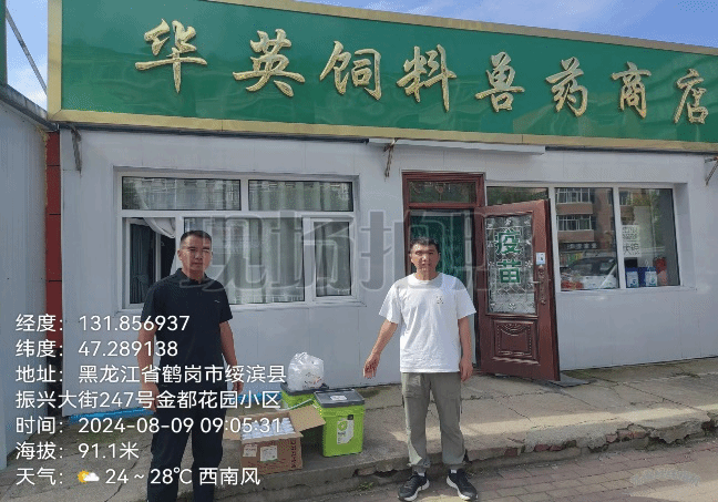 8月9日在绥滨县华英饲料兽药商店购买鹅日粮中所用的维生素饲料添加剂和畜舍环境消毒用的消毒药,随后前往绥滨县大鹅小镇、振荣村传民养殖场与鹅养殖户进行交流,并发放和指导兽药、消毒药使用方法,针对鹅养殖户提出的问题给出合理化建议和解决措施。