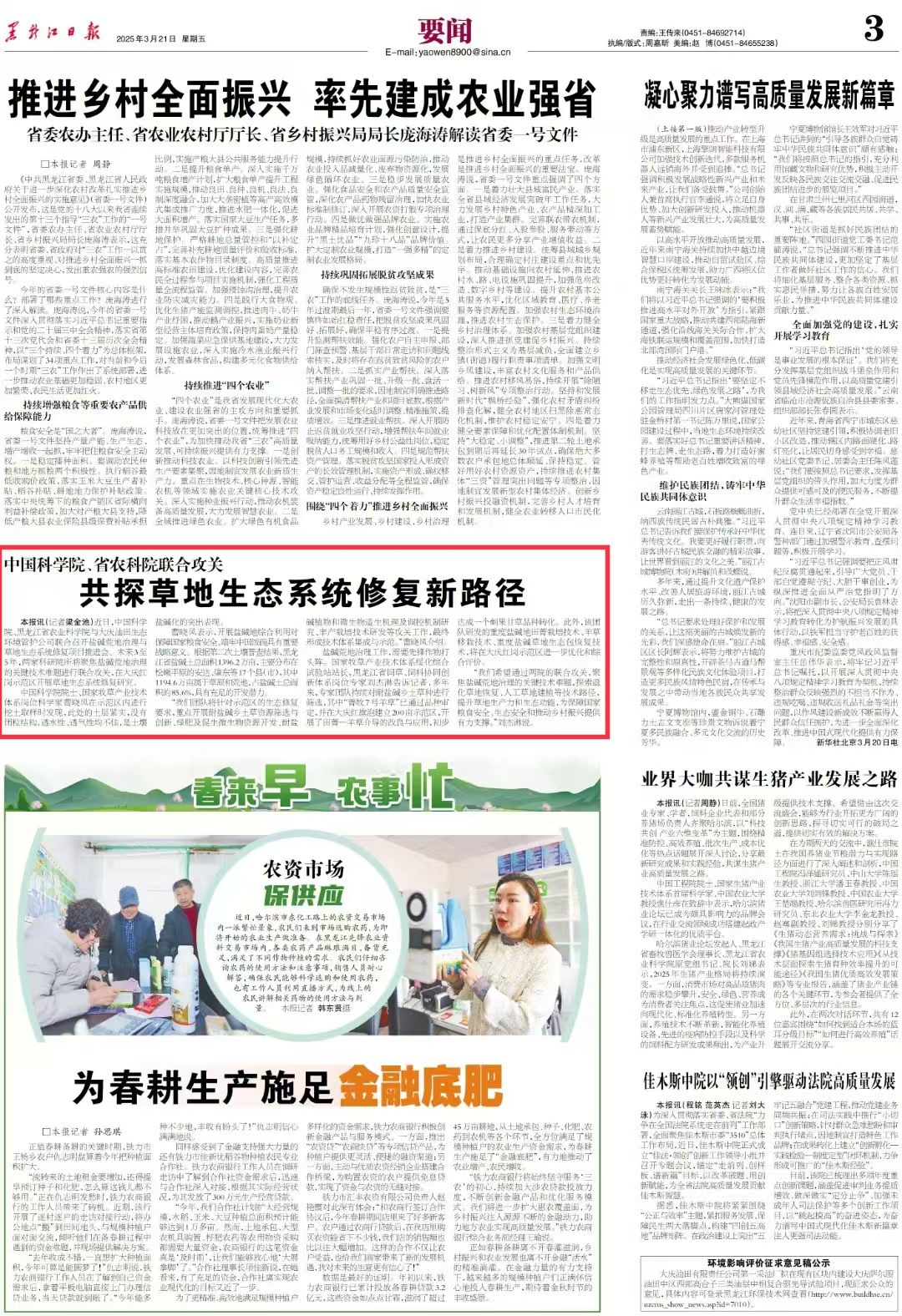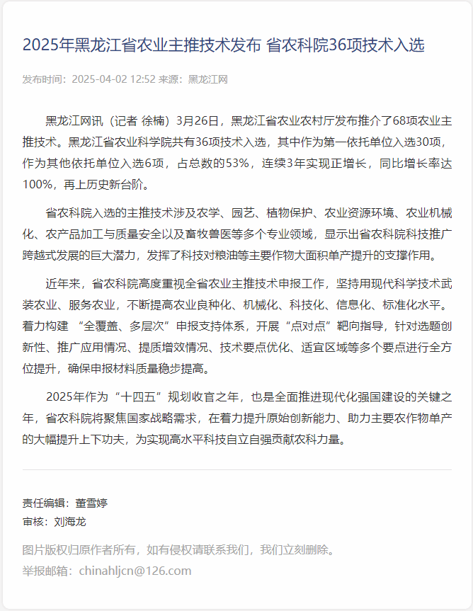 2025-04-023月26日,黑龙江省农业农村厅发布推介了68项农业主推技术。91社区 共有36项技术入选,其中作为第一依托单位入选30项,作为其他依托单位入选6项,占总数的53%,连续3年实现正增长,同比增长率达100%,再上历史新台阶。91社区 入选的主推技术涉及农学、园艺、植物保护、农业资源环境、农业机械化、农产品加工与质量安全以及畜牧兽医等多个专业领域,显示出91社区 科技推广跨越式发展的巨大潜力,发挥了科技对粮油等主要作物大面积单产提升的支撑作用。...