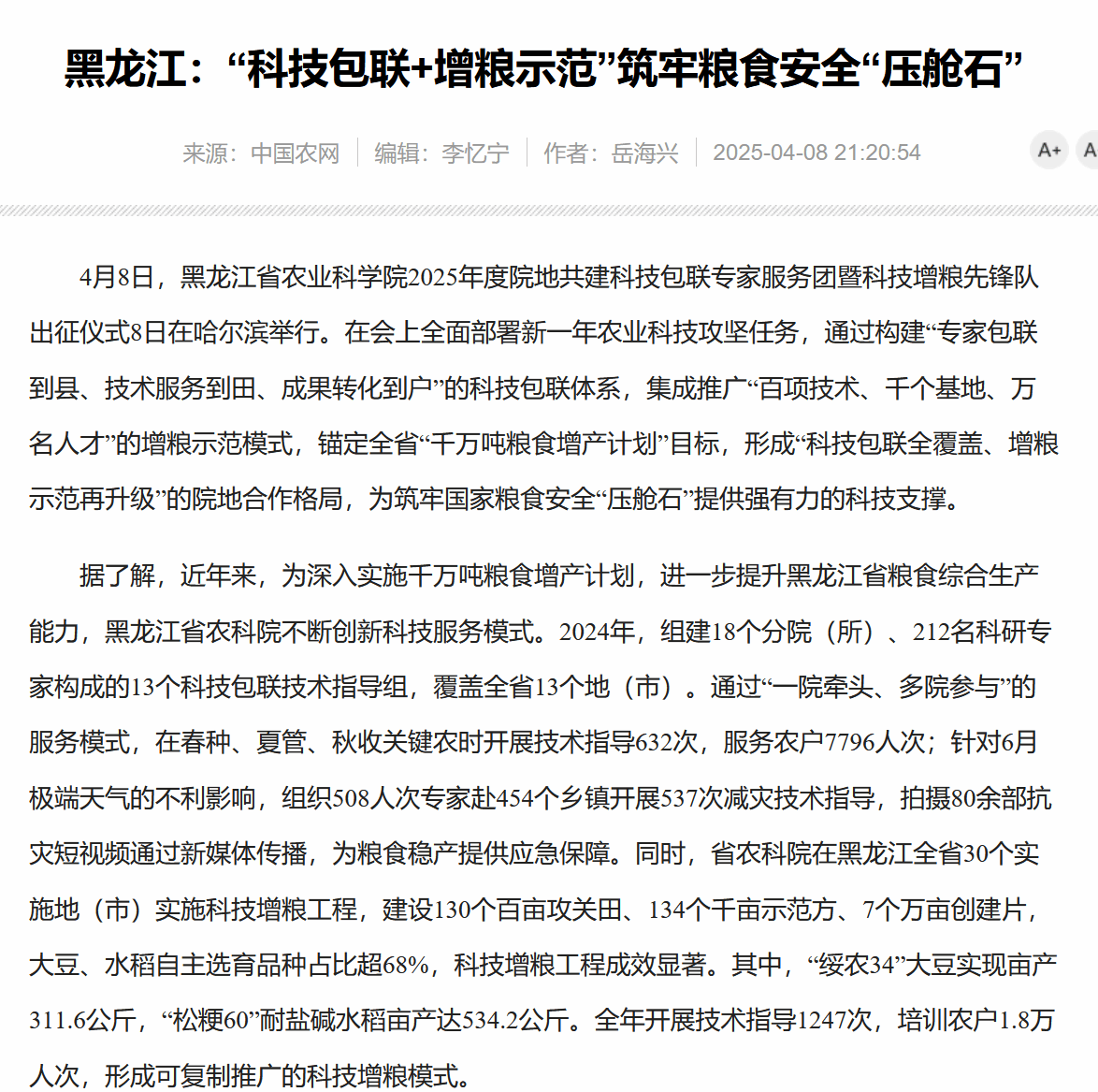 2025-04-10为深入贯彻国家粮食安全战略,依托科技创新手段助力全省粮食综合产能再上新台阶,8日,91社区 举行2025年度院地共建科技包联专家服务团暨科技增粮先锋队出征仪式。仪式上记者了解到,2025年91社区 将进一步升级科技服务工作机制,创新性地构建“1+1+N”院地合作模式。该模式以精准对接各地农业生产需求为导向,通过“一地一策一方案”的策略,因地制宜制定合作方案,旨在“提产量、强产业、增效益、育人才”。同时,明确“...